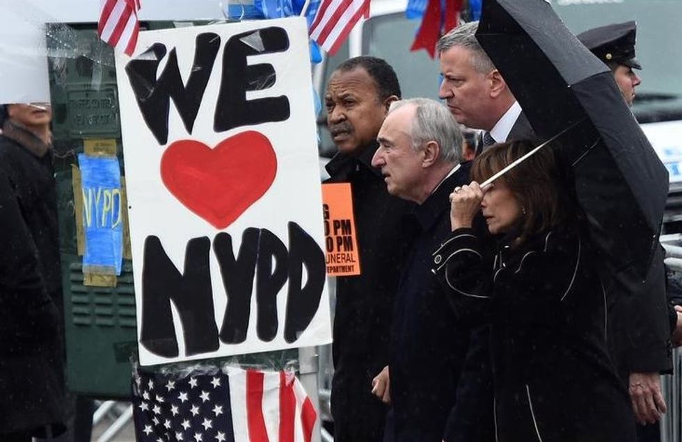 New York City Mayor Bill de Blasio (R) and Police Commissioner Bill Bratton (C) arrive to attend a wake for police officer Wenjian Liu at a funeral home in New York's borough of Brooklyn on January 3, 2015. Liu and partner Rafael Ramos were shot in the head on December 20, 2014, as they sat in their patrol car by suspected gunman Ismaaiyl Brinsley, who police said had a clear anti-police bias and posted Instagram comments that were anti-government and referenced two unarmed black men killed recently by police. Brinsley fled to a subway station after the shootings and committed suicide. (Jewel Samad/AFP/Getty Images)