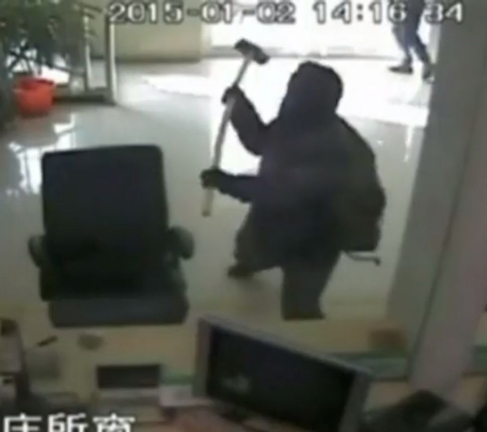 Wielding a sledgehammer, the 22-year-old busted his way into the back of the bank, as security camera video shows, but the Independent reported that a bank employee locked up most of the bank's cash before the man could get to it.