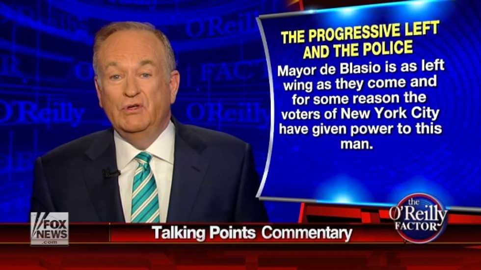 Warning of a "mini-crisis brewing in New York City," O'Reilly accused politicians like de Blasio of portraying police as those responsible for furthering injustice in the world.