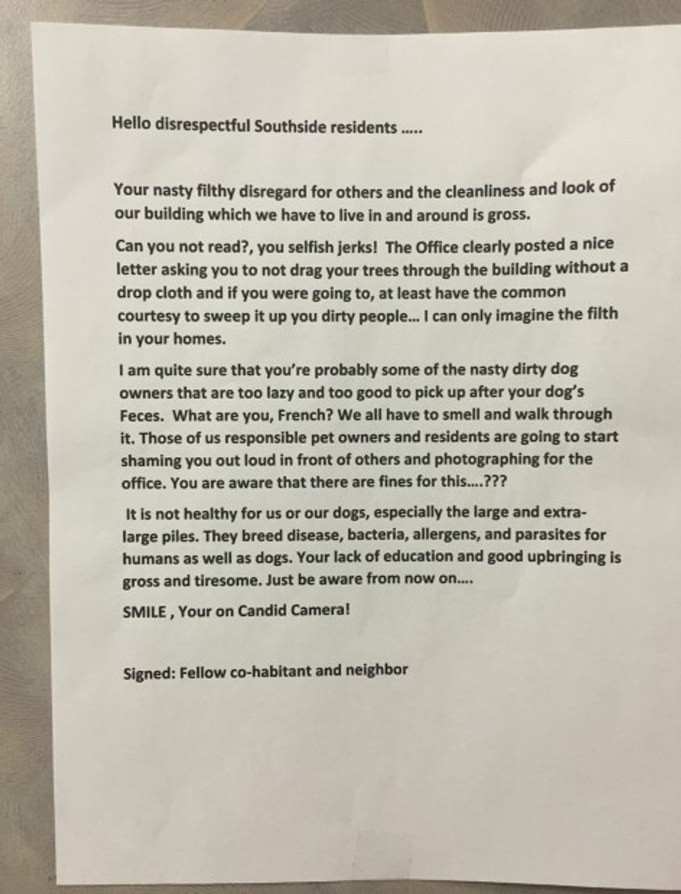 "Hello disrespectful Southside residents," the letter begins. "Your nasty disregard for others and the cleanliness and look of our building which we have to live in and around is gross."