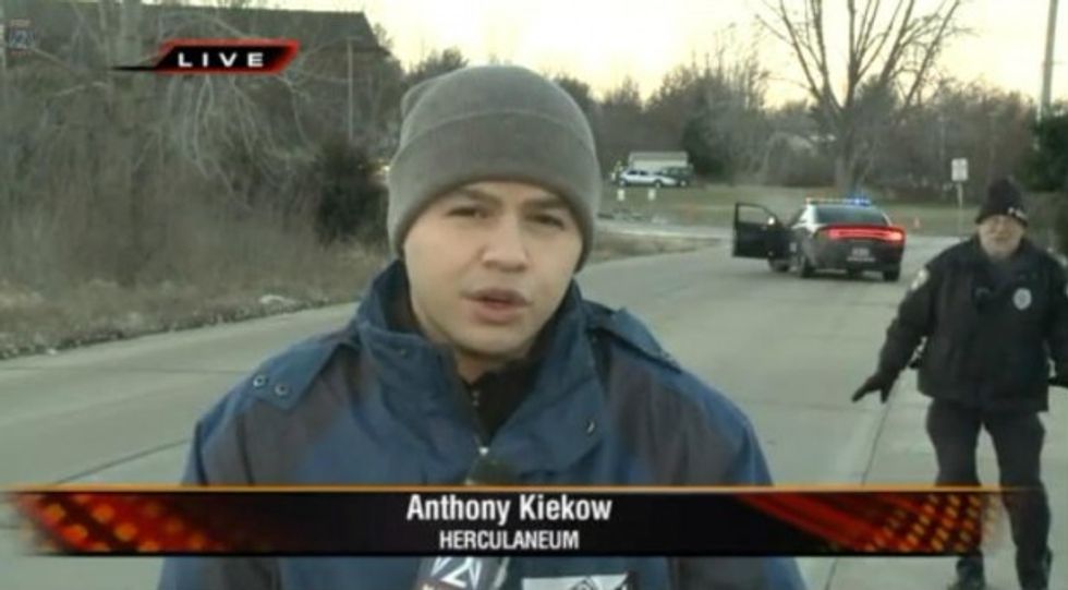 It's as if that was what one St. Louis-area police officer was told once he realized he'd stepped into a live shot of a local Fox reporter covering an apartment fire.