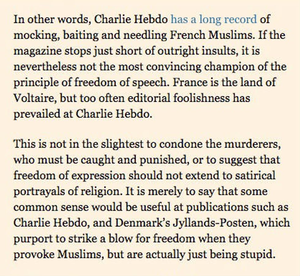 "It is merely to say that some common sense would be useful at publications such as Charlie Hebdo, and Denmark’s Jyllands-Posten, which purport to strike a blow for freedom when they provoke Muslims, but are actually just being stupid," he wrote.