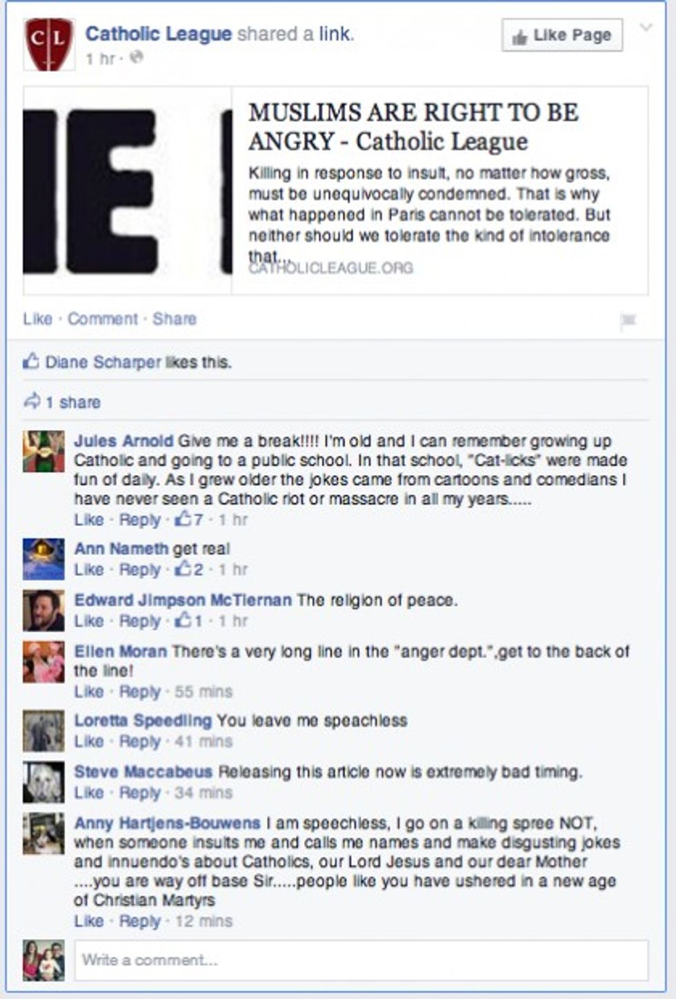 — AquinasMan (@AquinasMan) January 7, 2015The reaction on Facebook was similar, including several who said they were "speechless" by Donohue's stance.