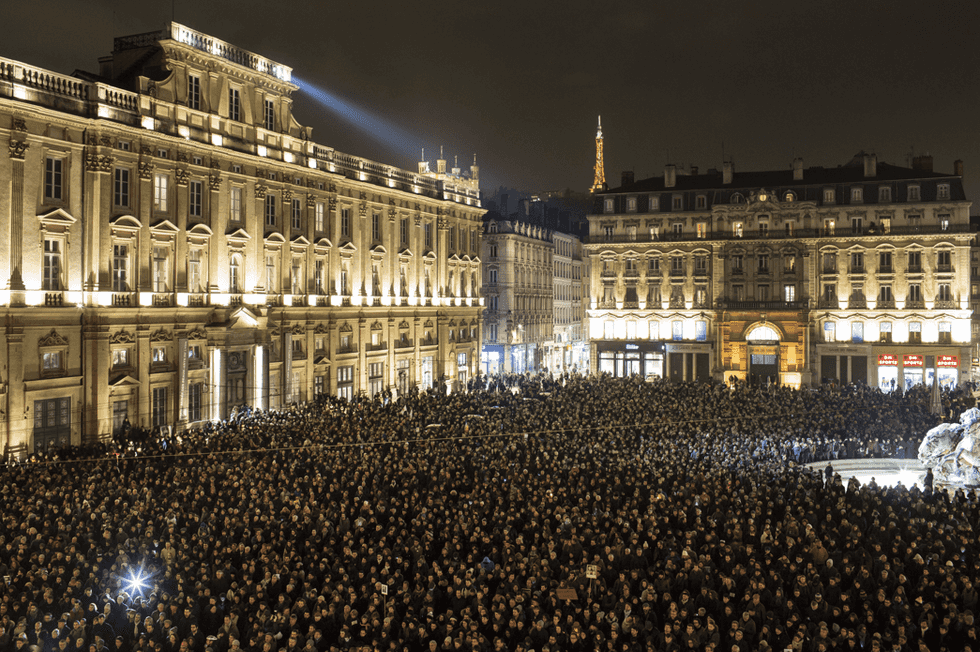 Thousands of people gather for a moment of silence to pay their respects to the victims of the deadly attack at the Paris offices of French satirical newspaper Charlie Hebdo, in Lyon, central France, Wednesday, Jan. 7, 2015. Masked gunmen stormed the Paris offices of a weekly newspaper that caricatured the Prophet Muhammad, killing at least 12 people, including the editor, before escaping in a car. It was France's deadliest postwar terrorist attack. (AP Photo/Laurent Cipriani)
