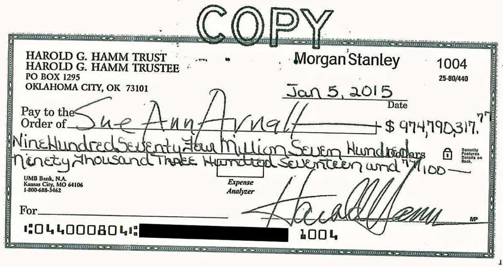 On Monday, Hamm delivered a handwritten check for $974,790,317.77, and she rejected that as well.
