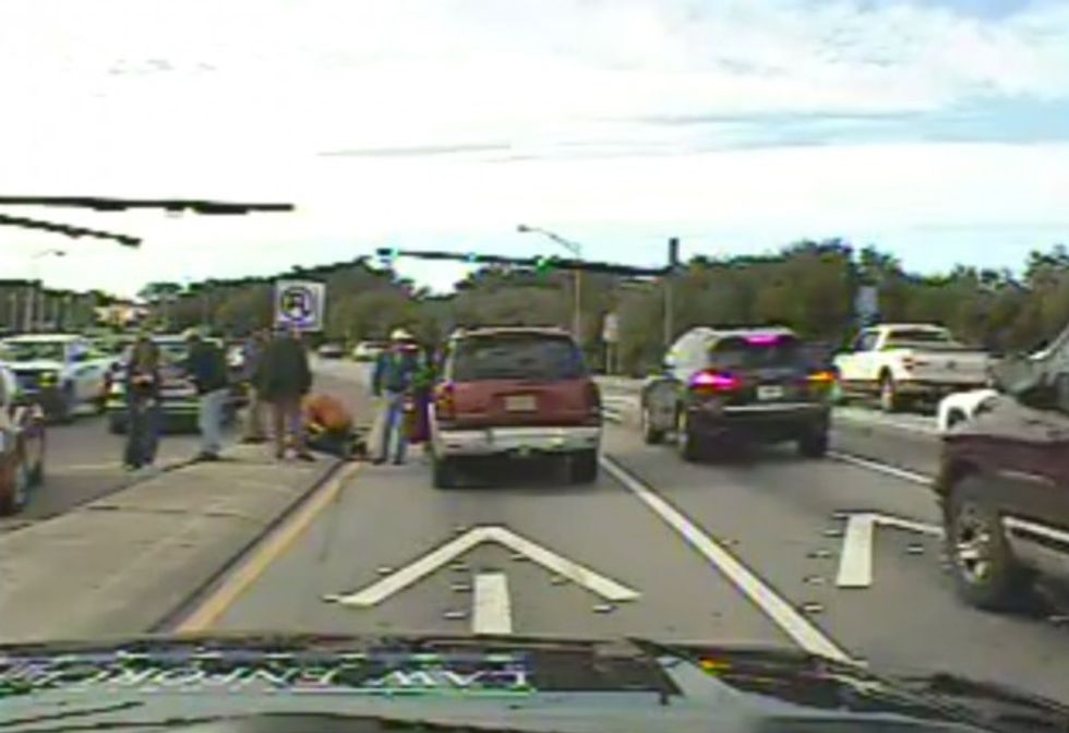Passers-by quickly gather, asking how they can help the fallen officer.
