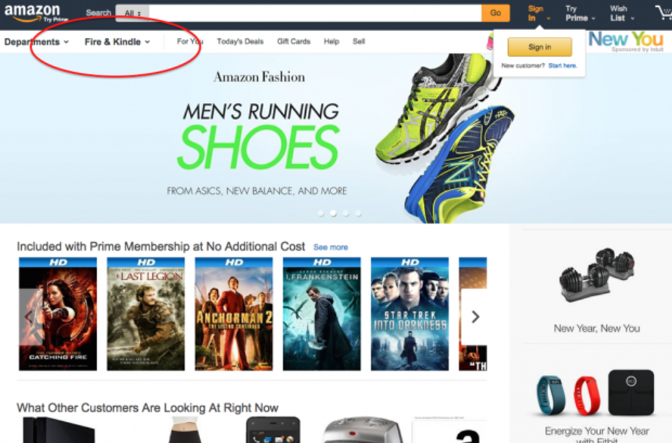 As Business Insider noted, one of the most obvious changes is the new "Fire and Kindle" drop-down at the top of the page, beneath a darkened header. The additional tab option takes customers directly to a page featuring its Fire phone, Fire TV and Kindle products, sales of which have largely disappointed investors.