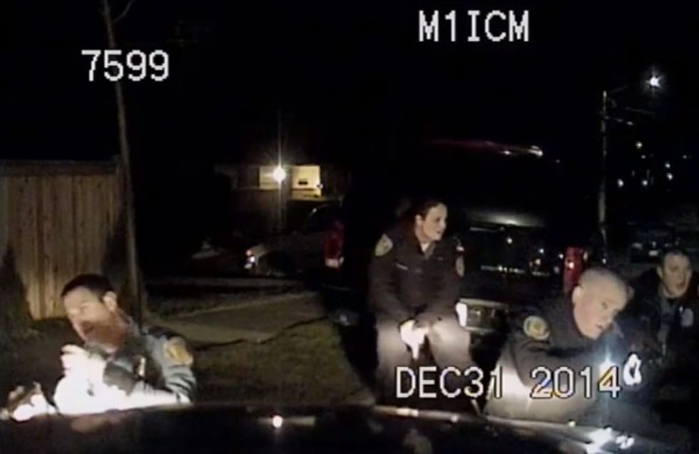 The clip showed four officers with their guns drawn; one was in a lighter-colored uniform than the other three.