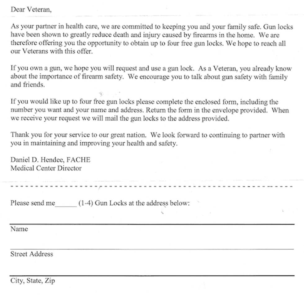 The letter said if the veteran wants one or more gun locks, they just need to complete the enclosed form and send it back. "When we receive your request we will mail the gun locks to the address provided," it said.