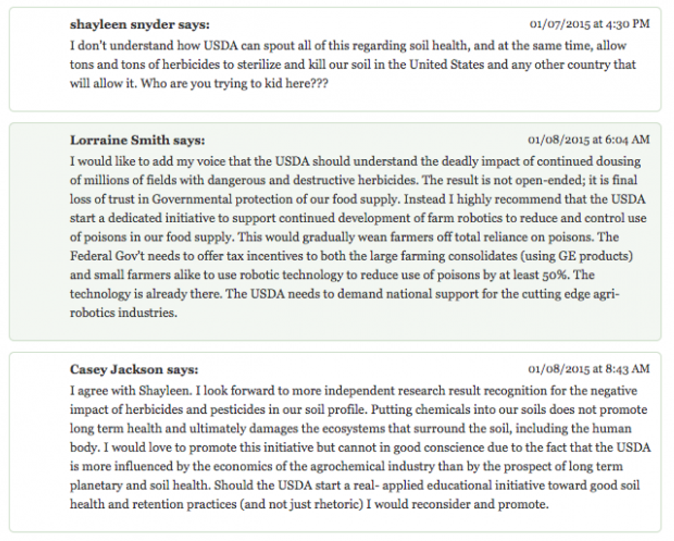 But the initiative has already led to some complaints that USDA's love for dirt is shallow. A few commenters on a USDA webpage said USDA isn't doing nearly enough to stop farmers from polluting soil with herbicides: