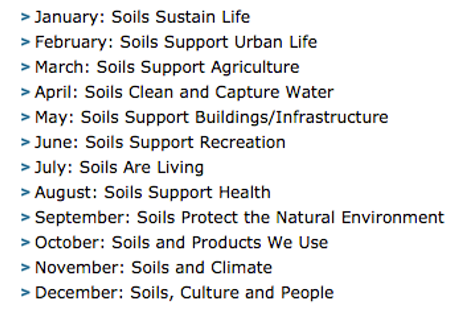 In a partnership with the Soil Science Society of America, USDA will use the theme "Soils Sustain Life" in January. Here's a list of all the other themes USDA will use throughout the year: