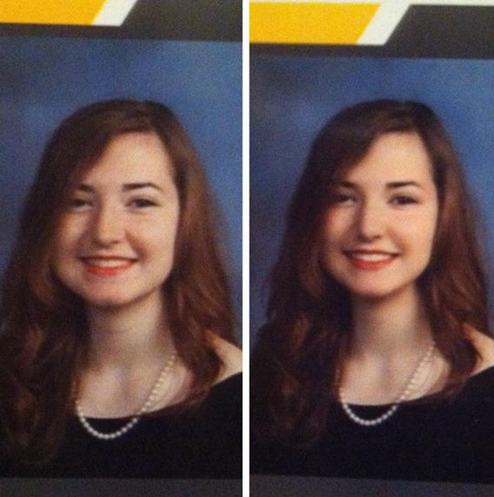 Original photo (left) is compared with edited yearbook and student ID photo (right) after student claims the company her school hired retouched her photo. (Image source: imgur.com)