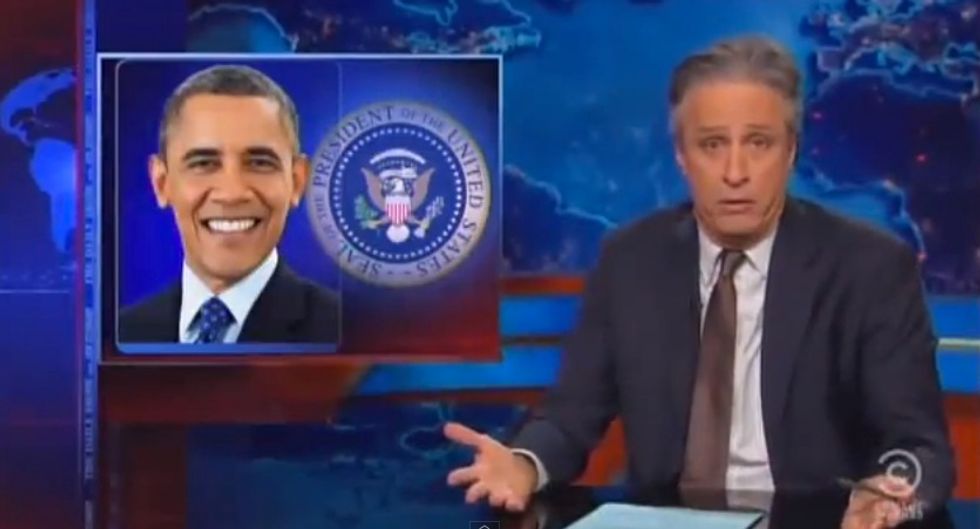 "And of course, no grand show of liberty is complete without America, the country that invented freedom. That's why President Obama was there, front and center," Stewart said, before airing news reports noting Obama's very noticeable absence.
