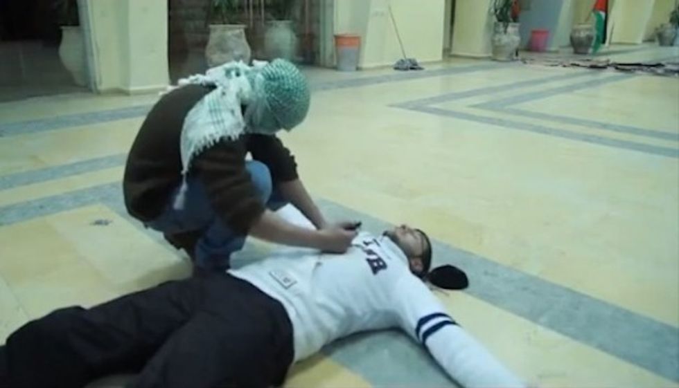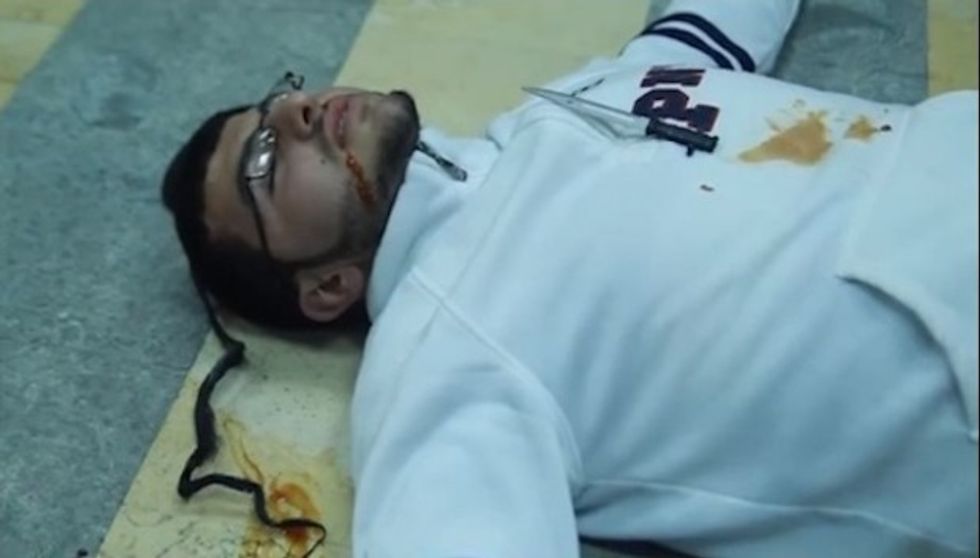 The "settler" is stabbed to death for his crime of occupying Palestinian land, the key message the student dramatization conveyed. (Screenshot: YouTube)
