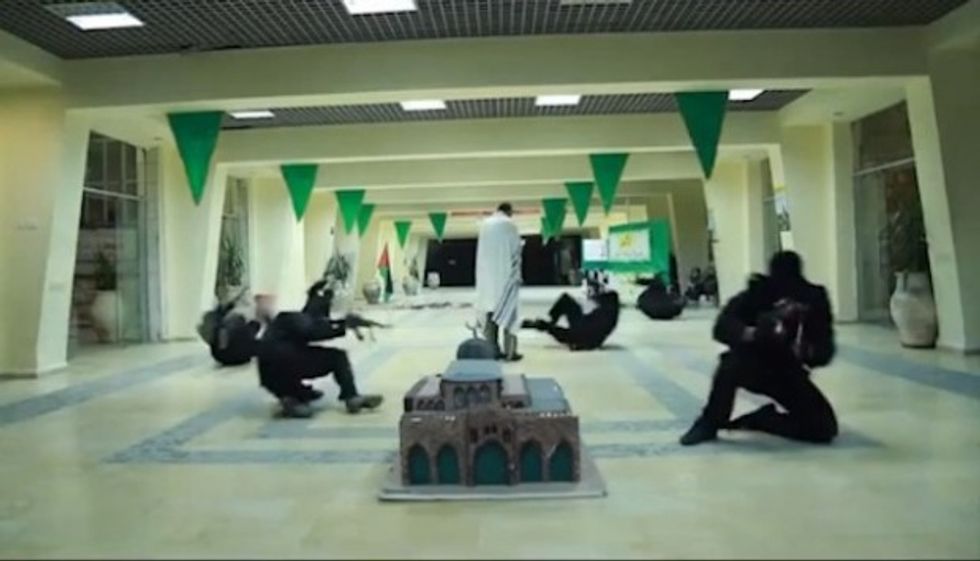The video, which featured no dialogue and was set to Arabic music, showed the stabbing of the “settler,” the shooting of the “rabbi” and the triumphant arrival of men dressed in commando-type garb with their faces covered, presumably playing the role of Hamas terrorists. At the end, the men pray toward a replica of the Al-Aqsa mosque in Jerusalem.