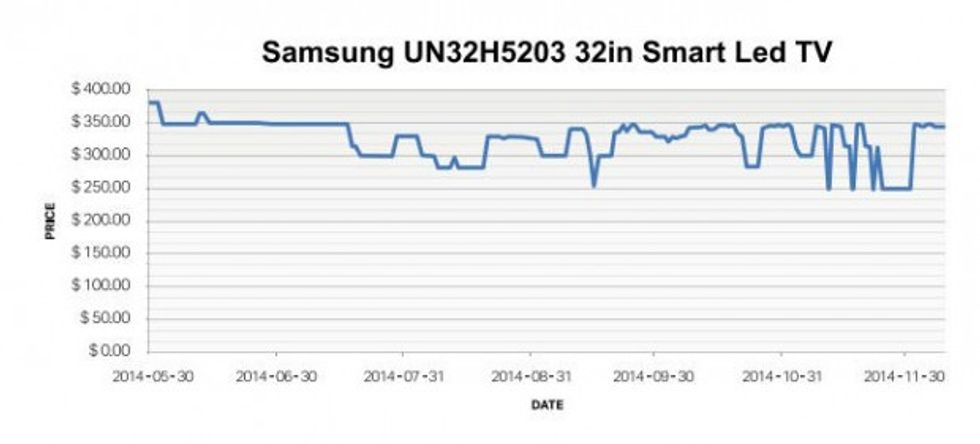 Boomerang gave one example in which it says Amazon lowered the price of a Samsung TV in the months leading up to the holidays. This chart shows the difference in price of the same TV from June through November: