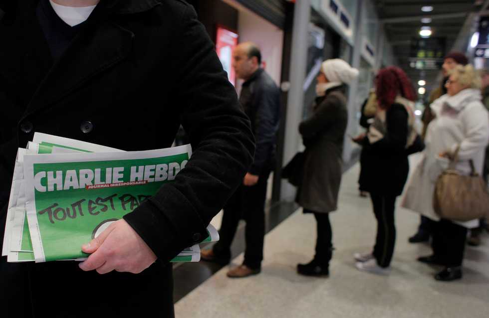 A man leaves after buying Charlie Hebdo newspapers as people queue at a newsstand in Paris, Wednesday, Jan. 14, 2015. (AP Photo/Christophe Ena)