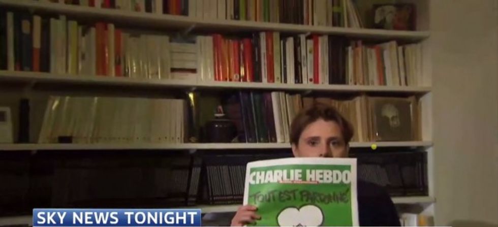 Journalist Caroline Fourest, a former writer at the French satirical weekly publication Charlie Hebdo, continued to blast news outlets for refusing to show the newspaper’s latest cover featuring a cartoon of the Prophet Muhammad, defiantly holding up a copy during a live interview on Sky News on Wednesday.