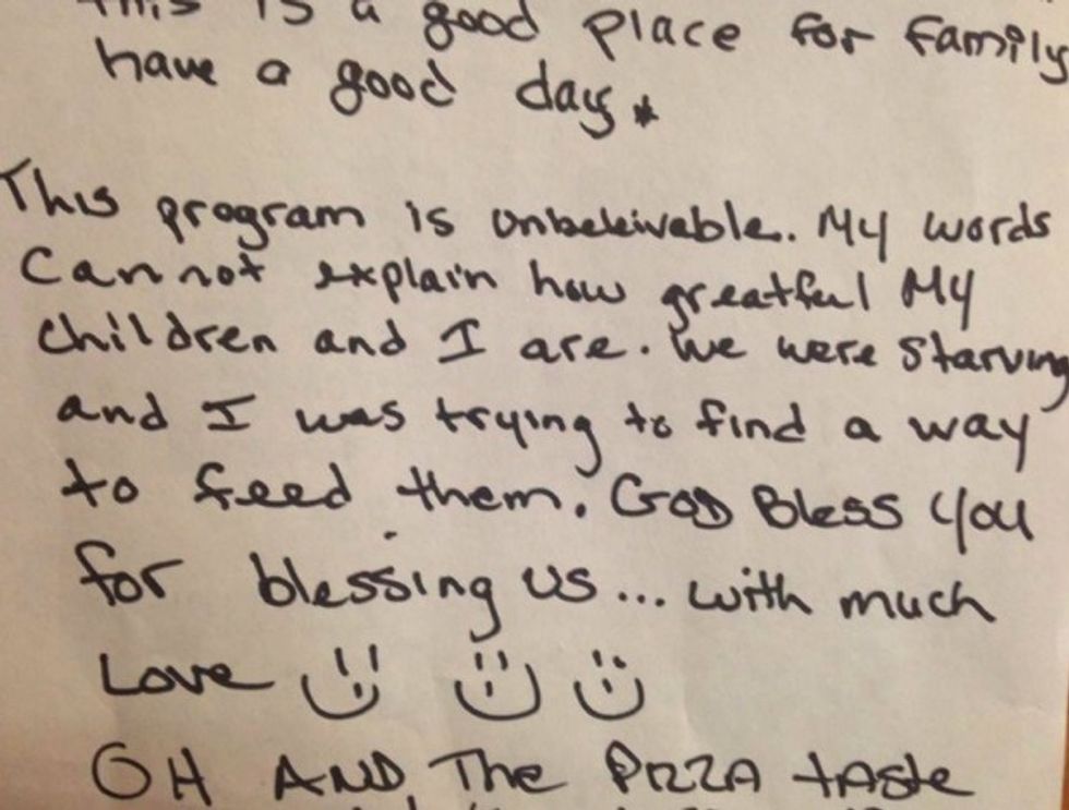 "This program is unbelievable. My words cannot explain how grateful my children and I are," it read. "We were starving and I was trying to find a way to feed them. God bless you for blessing us."