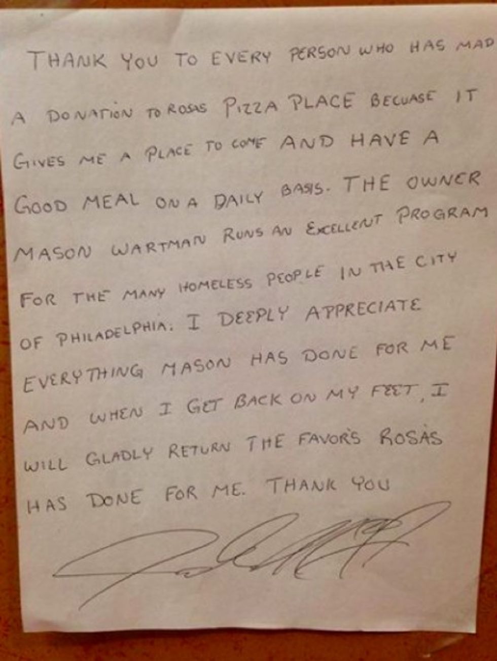 Another note from a person who has been homeless for the past six years read, "I deeply appreciate everything Mason has done for me and when I get back on my feet I will gladly return the favors Rosa's has done for me. Thank you."