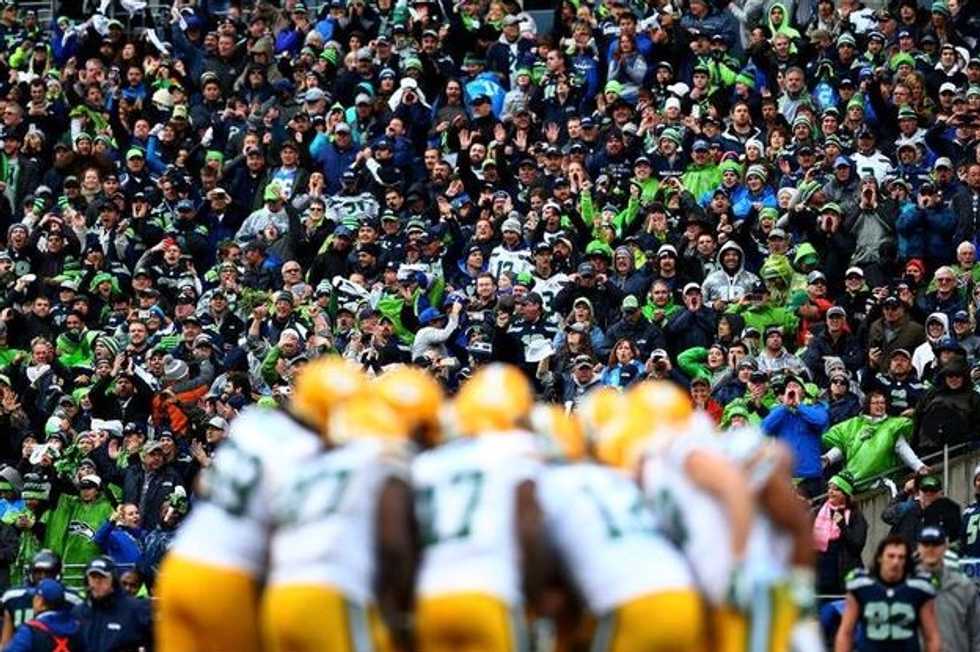 The Green Bay Packers huddle in the fourth quarter of the 2015 NFC Championship game against the Seattle Seahawks at CenturyLink Field on January 18, 2015 in Seattle, Washington. (Ronald Martinez/Getty Images)