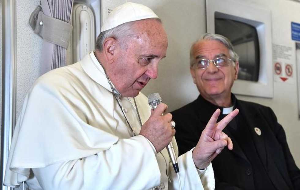 Pope Francis, left, gestures as he talks with journalists during his flight from Manila to Rome, Monday, Jan. 19, 2015. Pope Francis flew home Monday after a weeklong trip to Asia, where he called for unity in Sri Lanka after a civil war and asked Filipinos to be "missionaries of the faith" in the world's most populous continent after a record crowd joined his final Mass in the Philippine capital. (AP Photo/Giuseppe Cacace, pool)