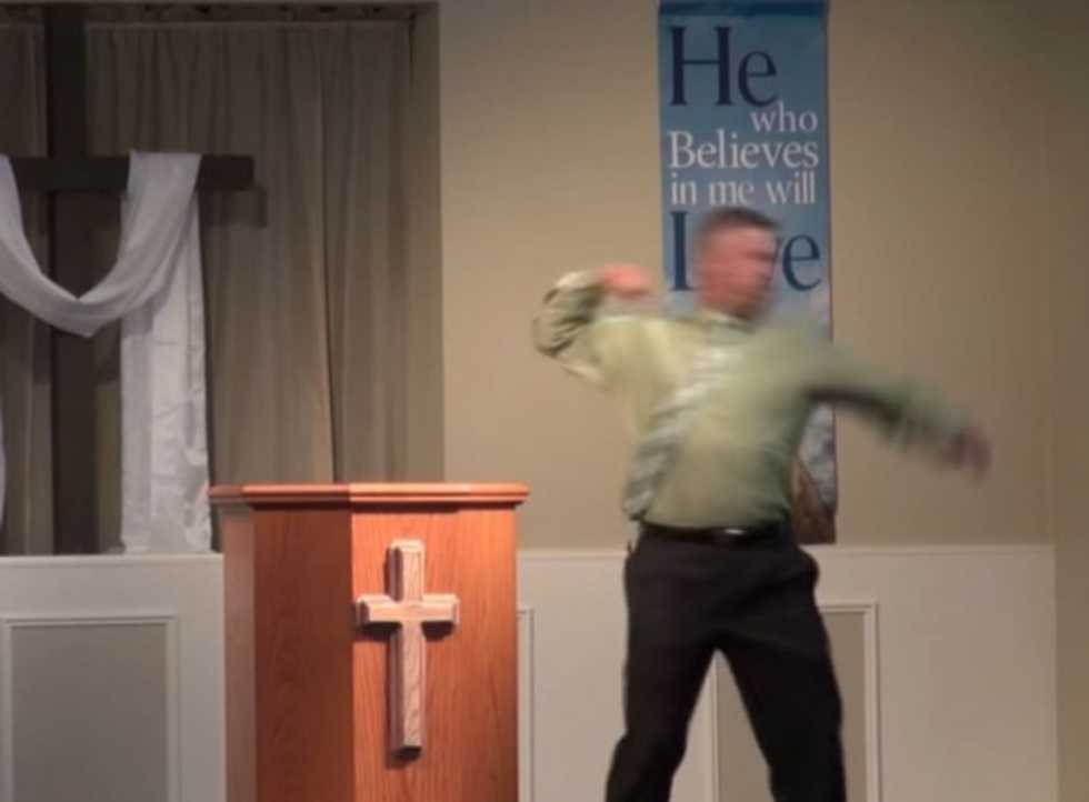 Then he jokes about "a new policy" at Bible Baptist Church, drawing chuckles from the audience with the implication of violence, before saying, "There might be times where that happens."