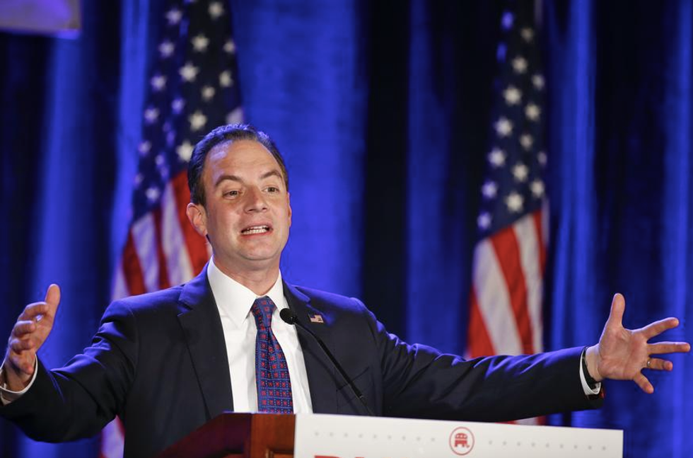 Reince Priebus, Chairman of the Republican Party, introduces Dr. Ben Watson as the luncheon speaker at the Republican National Committee meetings Thursday, Jan. 15, 2015, in San Diego. (AP Photo/Lenny Ignelzi)