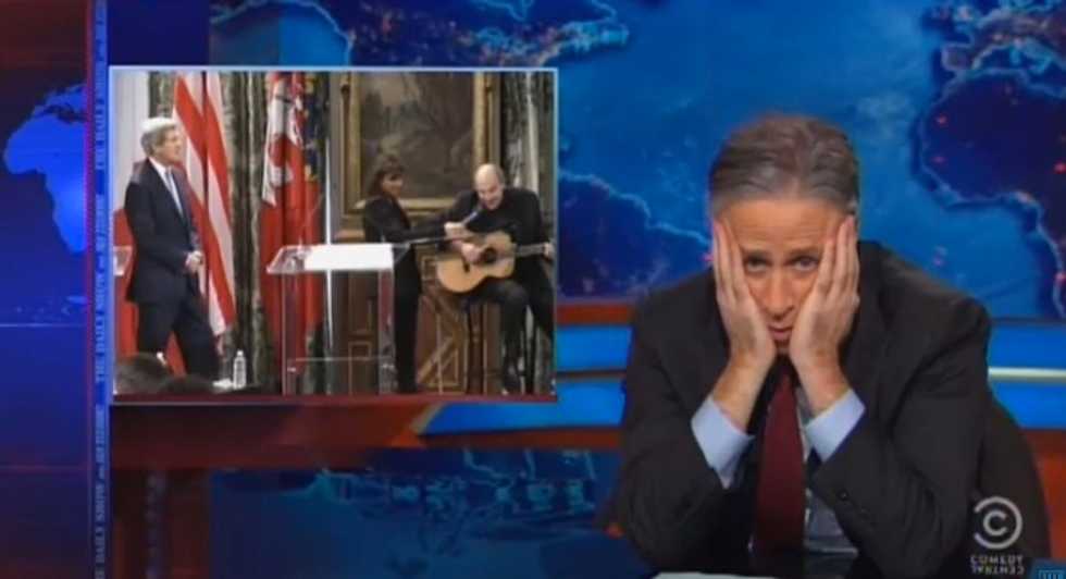Stewart Mocks Kerry's Visit to France in Scathing Segment: 'Are You Trying to Get Us in a War?