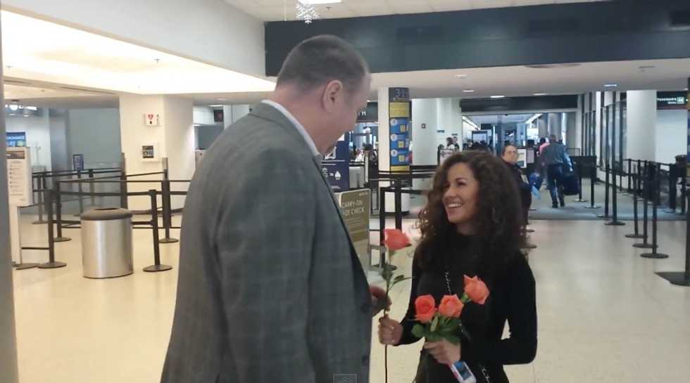 Aaron Vergara wrote on the video published Jan. 1 that he asked eight individuals to walk off the plane and hand his girlfriend a rose. Each rose represented a month the two had been away from each other.