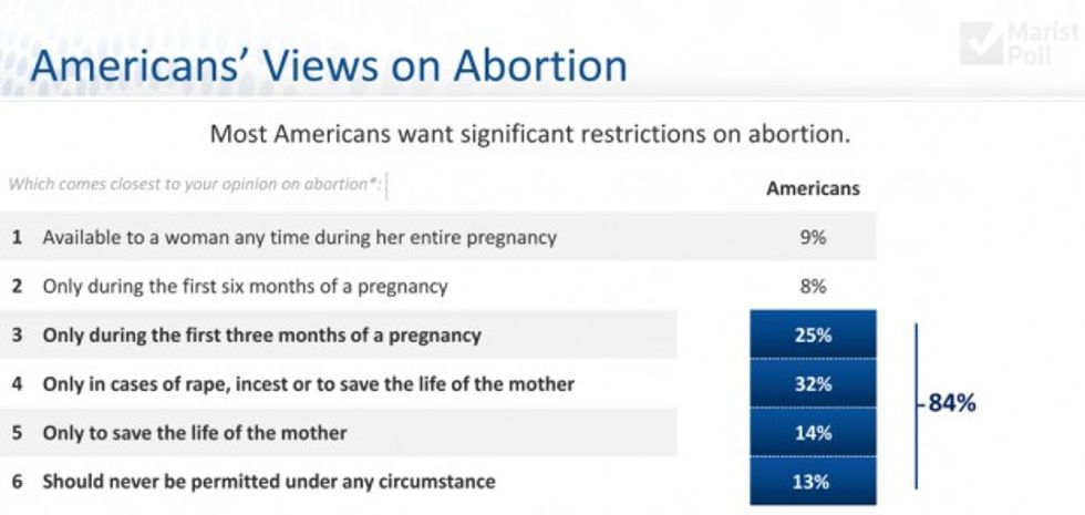 A new Knights of Columbus-Marist poll found that, on the whole, 84 percent of Americans favor restrictions on abortion. While the majority of self-professed pro-lifers agreed with this sentiment, so too did 69 percent of those who call themselves pro-choice.