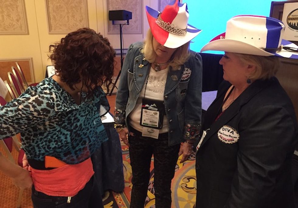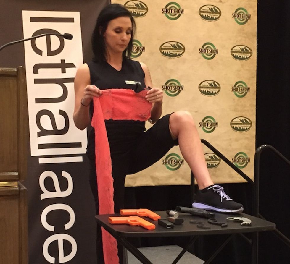 At a SHOT Show event specifically for women who carry concealed weapons and sporting "typical comfy, busy-mom wear" of yoga pants and a casual shirt, Renaud started pulling guns, extra clips, mace, knives, and brass knuckles from all over her body.