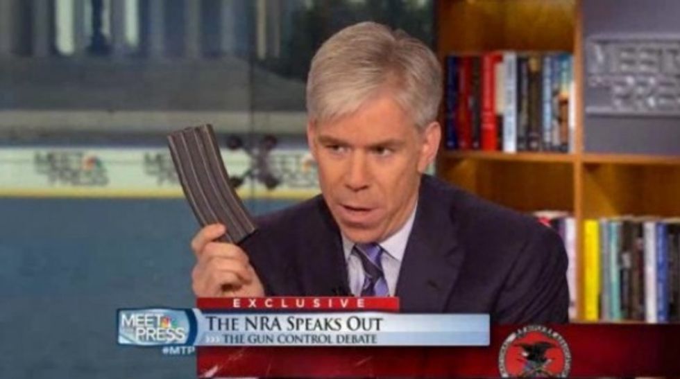 David Gregory held up a magazine for ammunition on “Meet the Press” in December 2012. (Image source: NBC)\n
