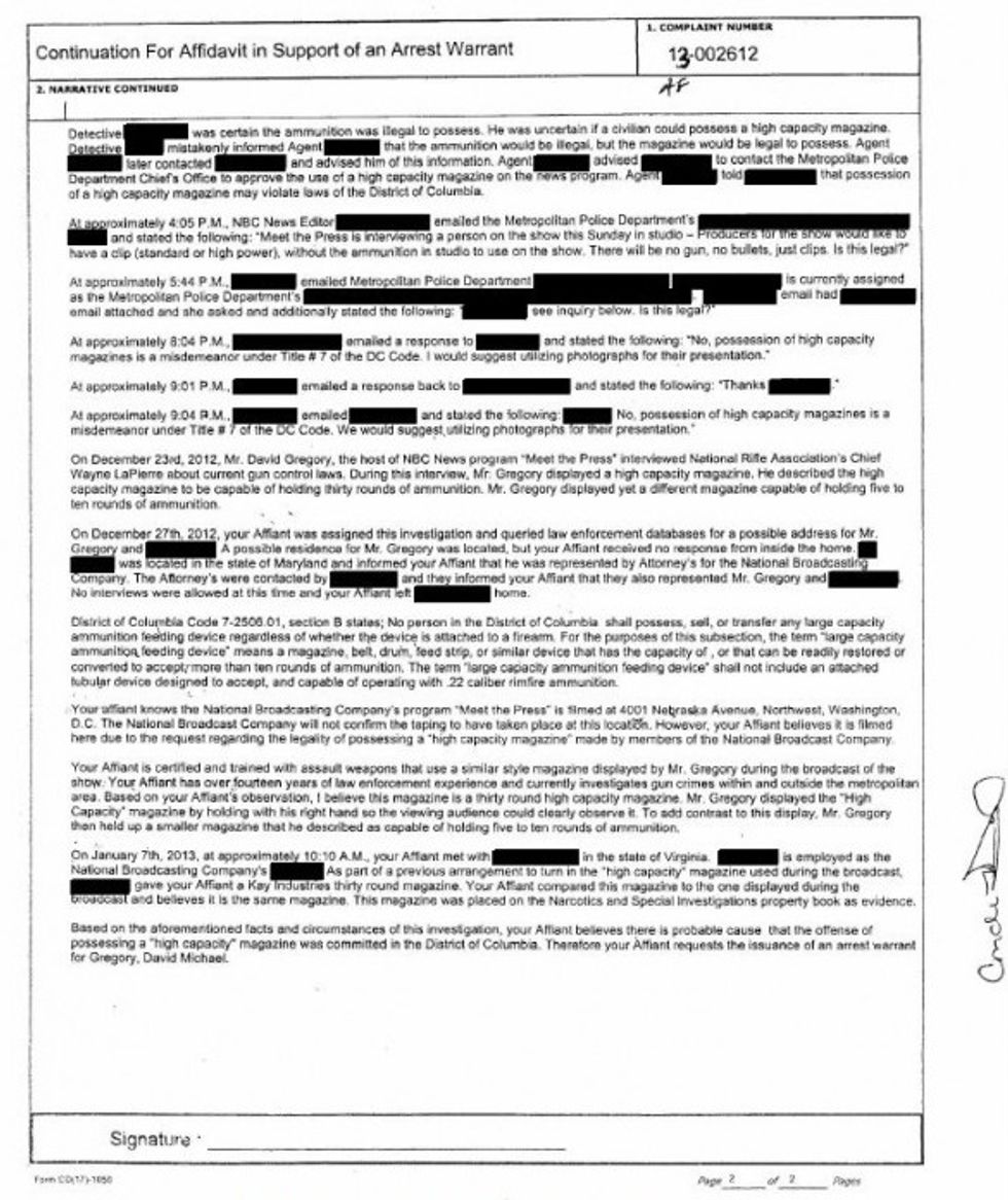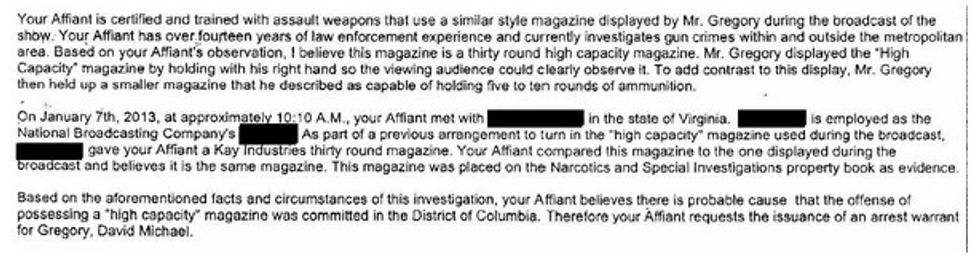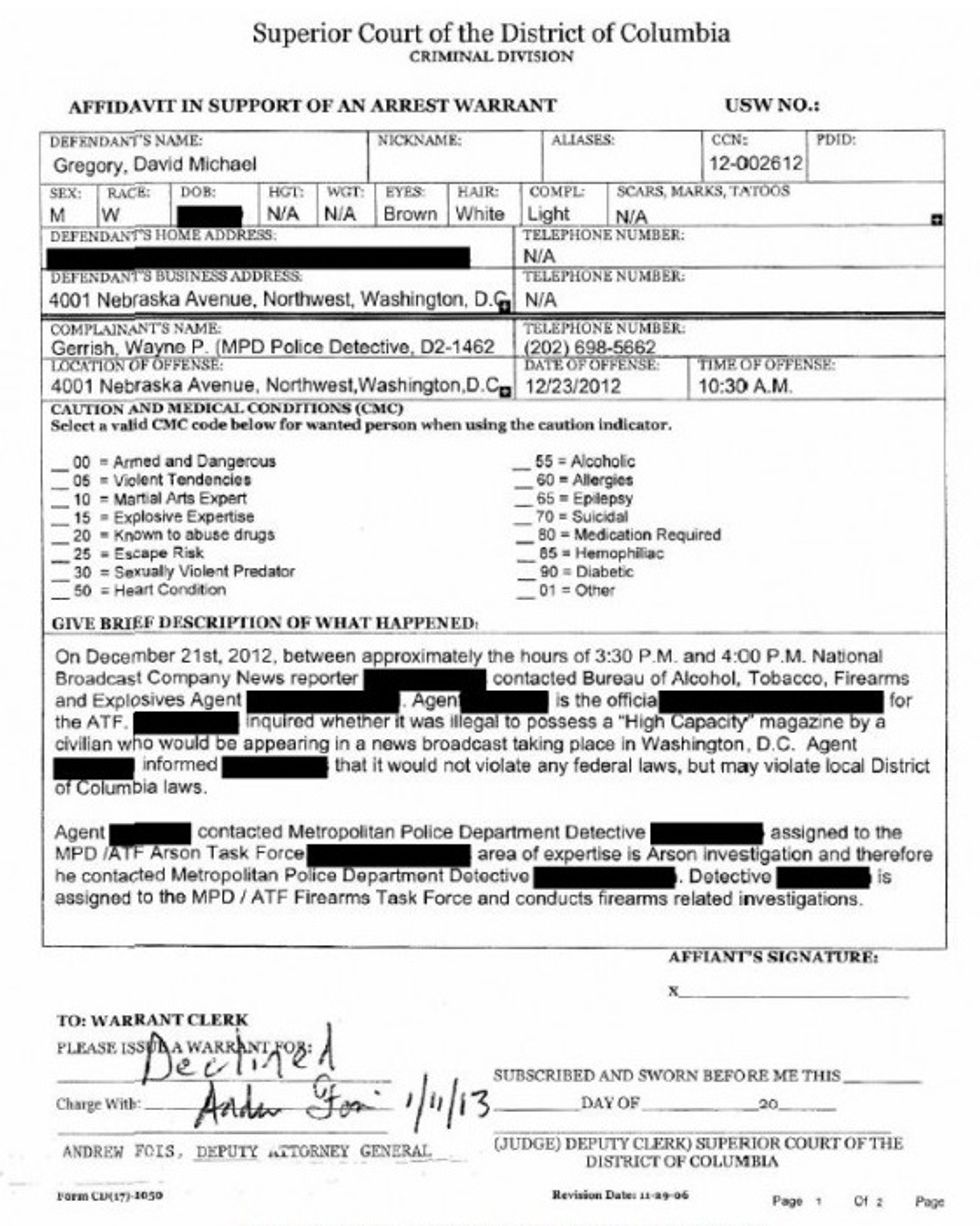 In it, the investigator wrote in the affidavit that “there is probable cause that the offense of possessing a ‘high-capacity’ magazine was committed in the District of Columbia. Therefore your Affiant requests the issuance of an arrest warrant for Gregory, David Michael.”