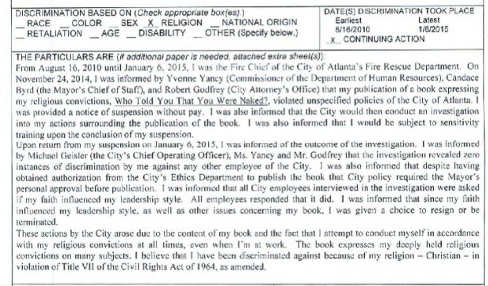 "Allied attorney Jonathan Crumly filed an EEOC complaint on behalf of Chief Cochran yesterday based on the City's clear religious discrimination against the Chief," read a statement issued to TheBlaze by Alliance Defending Freedom senior counsel Jeremy Tedesco. "Americans are guaranteed the freedom to live without fear of losing their jobs because of their beliefs and thoughts."