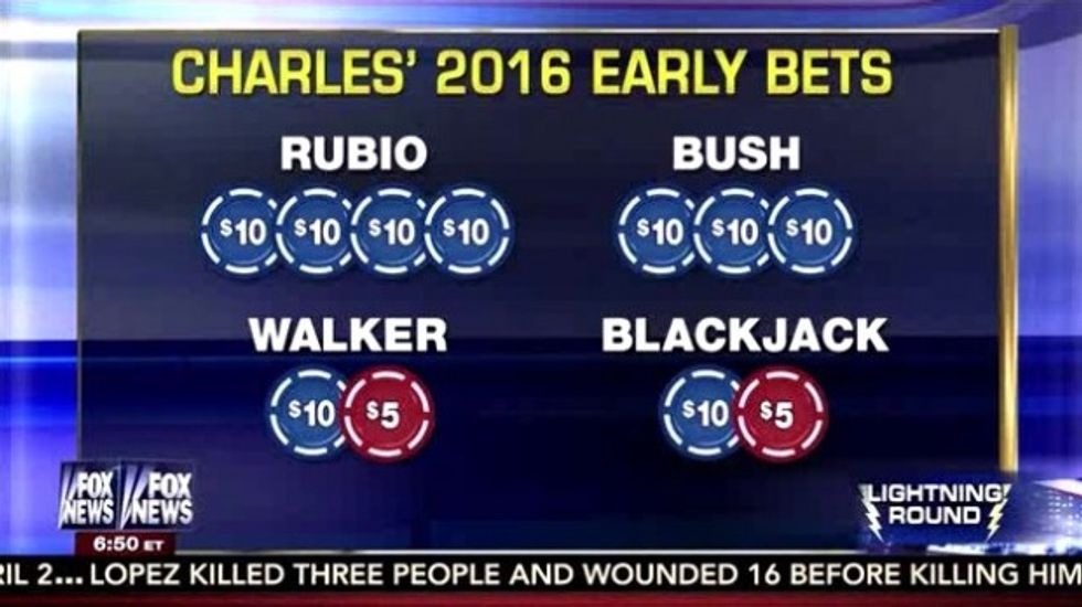 "$40 on Rubio, $30 on Bush, $15 on Scott Walker and I'd blow the rest on booze," Krauthammer responded, adding that Rubio is an "underestimated, dark horse candidate who threads his way."