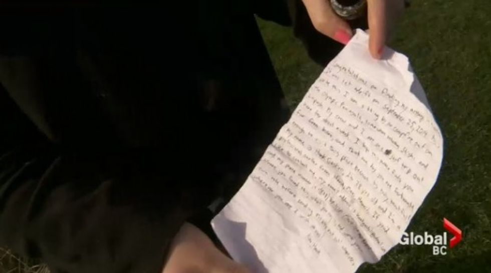 "There happened to be a tiny bottle sticking up a tiny bit and I kicked it to expose it and then we noticed that there was a paper inside," Williams told Global News.