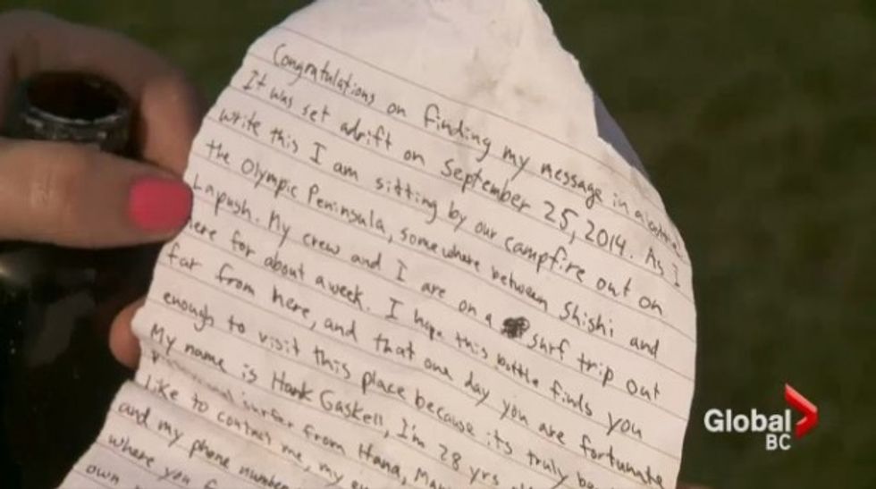 Inside was a note authored by professional surfer Hank Gaskell who penned the message while competing in a September surf contest in Washington State.