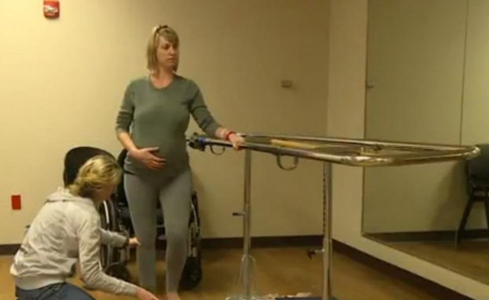 Emily Nalepa gets therapy while trying to walk again at eight-months pregnant. (Image source: WFAA-TV)