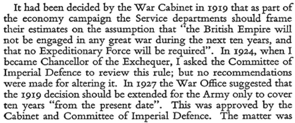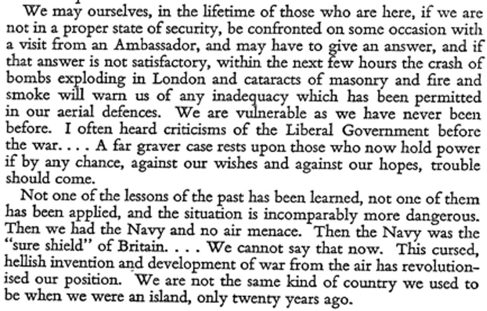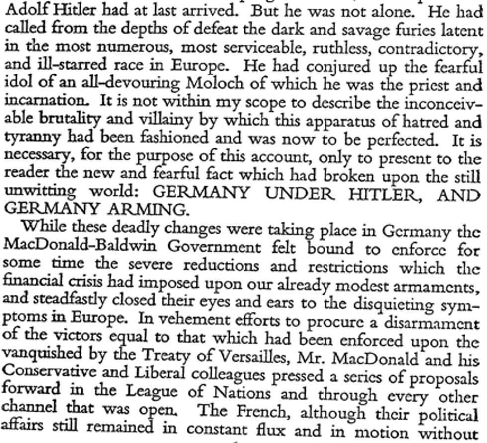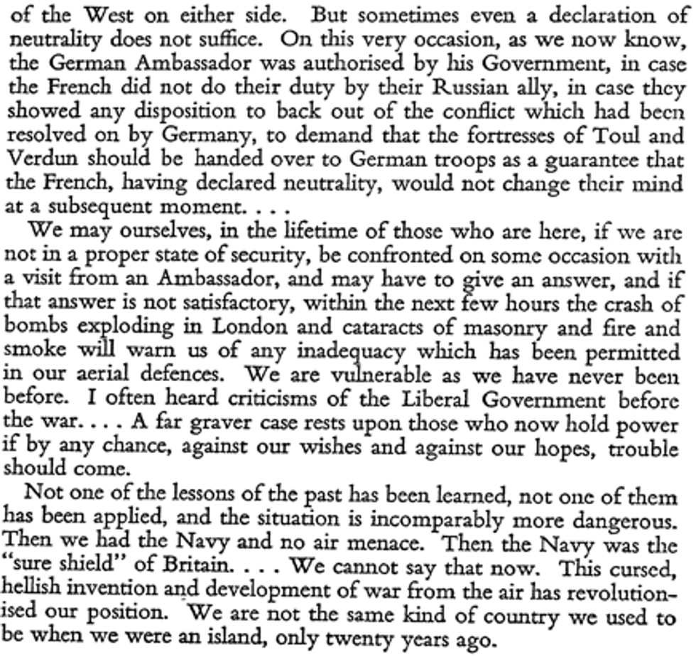 8. "While these deadly changes were taking place in Germany the...[British government] felt found to enforce...the severe reductions and restrictions which the financial crisis had imposed upon our already modest armaments, and steadfastly closed their eyes and ears to the disquieting symptoms in Europe."
