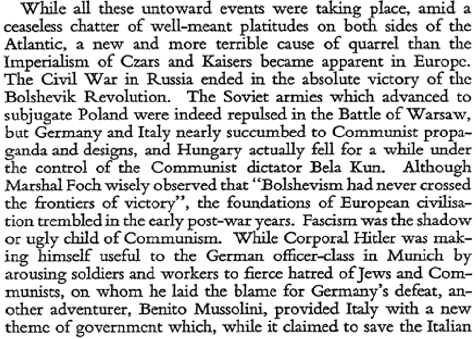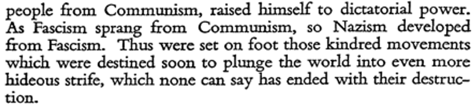 3. "As Fascism sprang from Communism, so Nazism developed from Fascism. Thus were set on foot kindred movements which were destined soon to plunge the world into even more hideous strife, which none can say has ended their destruction."