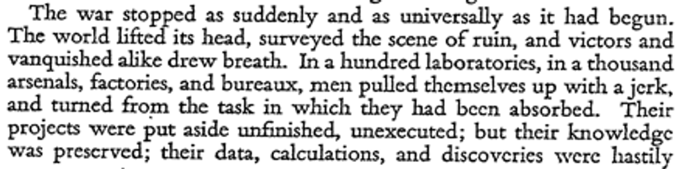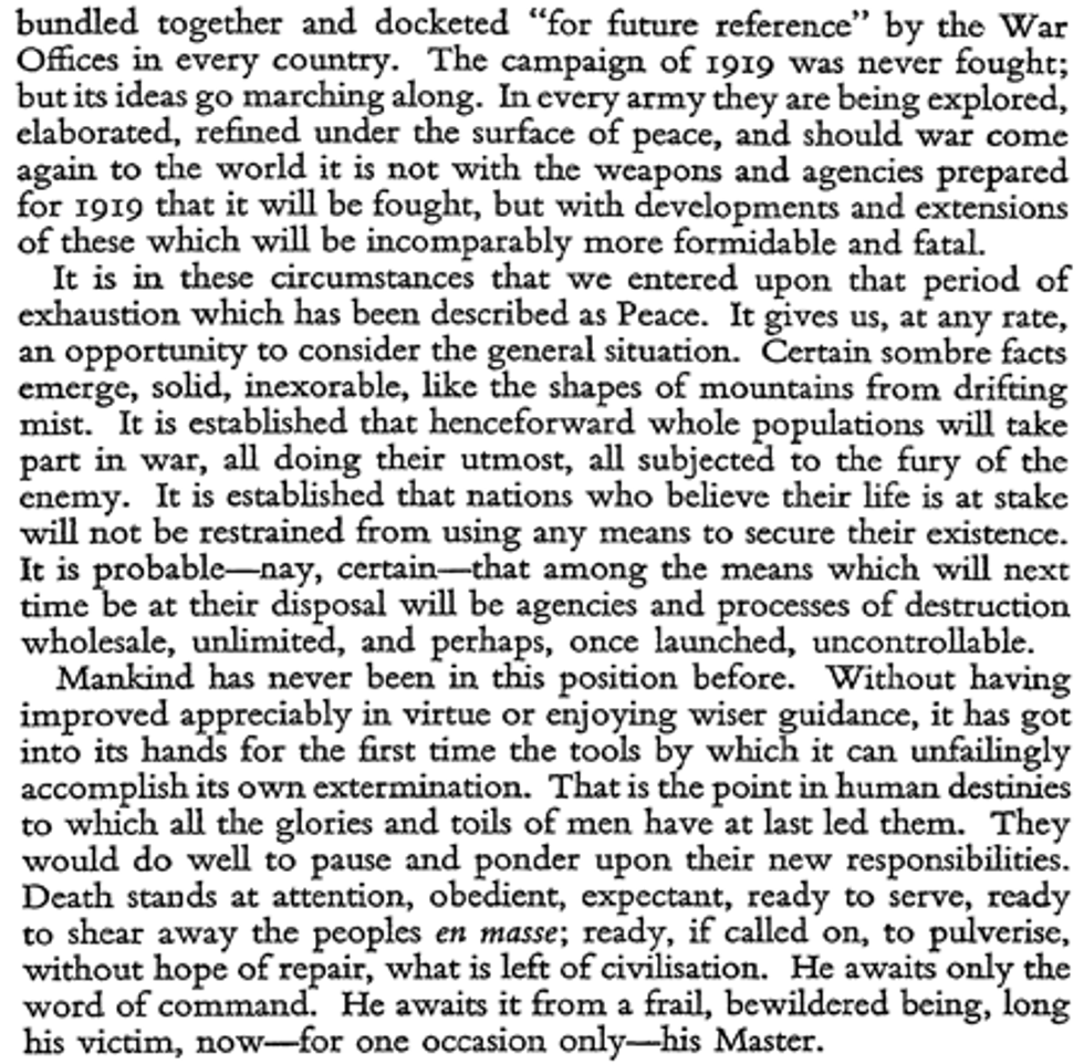 5. "Mankind has never been in this position before. Without having improved appreciably in virtue or enjoying wiser guidance, it has got into its hands for the first time the tools by which it can unfailingly accomplish its own extermination."