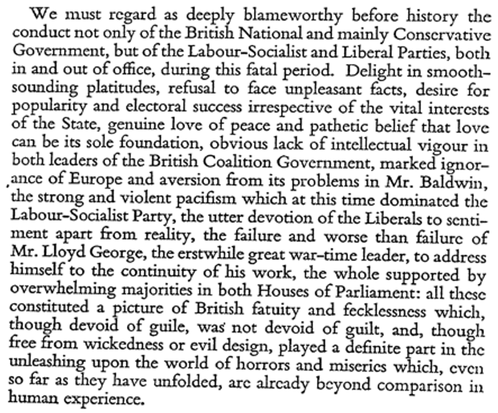 11. "Delight in smooth-sound platitudes, refusal to face unpleasant facts, desire for popularity and electoral success irrespective of the vital interests of the State, genuine love of peace and pathetic belief that love can be its sole foundation, obviously lack of intellectual vigour...strong and violent pacifism...played a definite part in the unleashing on the world of horrors and miseries..."