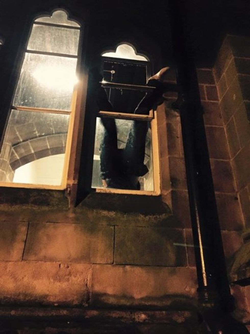 De Niet's drinking buddy Tom Burdett added, "I turned the corner and saw a pair of legs sticking out of a window quite far up. I was in pure hysterics. I couldn't stop laughing for a good few minutes."