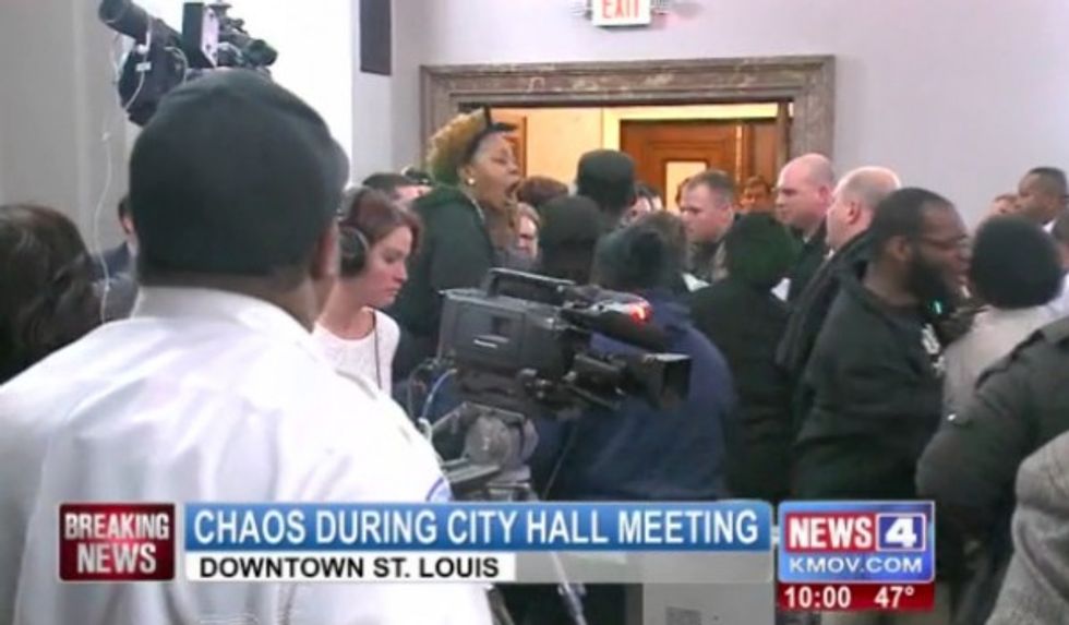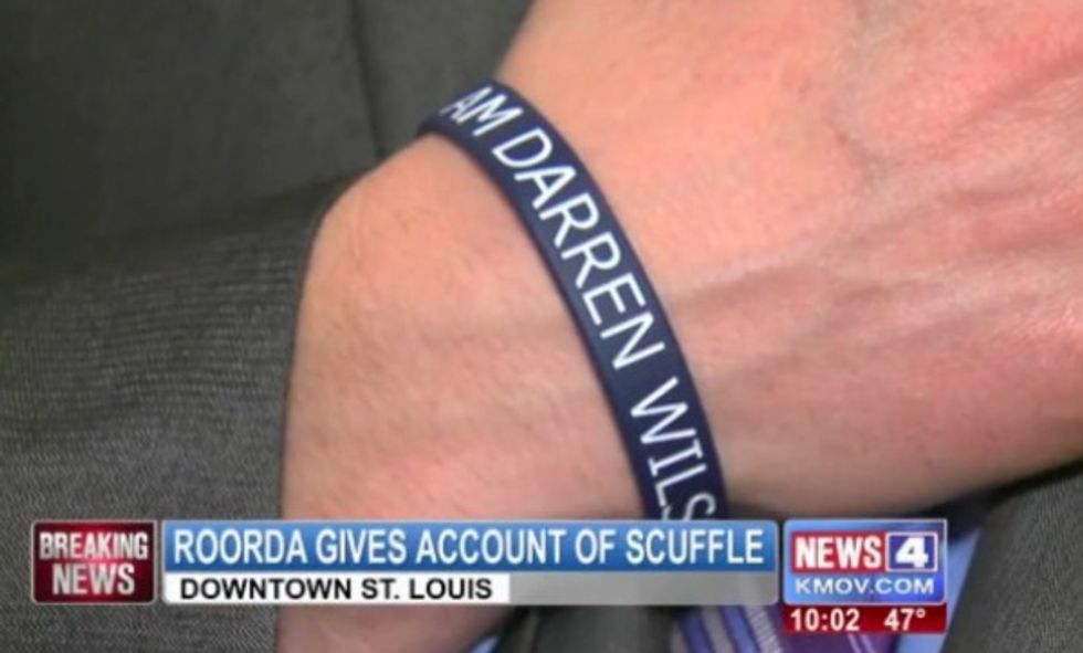 Before a St. Louis City Hall meeting on a possible police oversight civilian board turned into a shoving match Wednesday, the mood in the room reportedly turned sour when some spotted a man wearing an "I am Darren Wilson" bracelet.