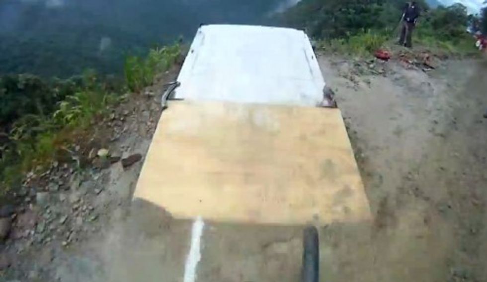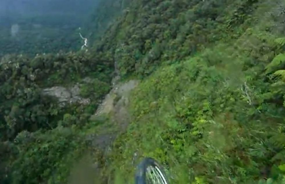 A bike rider's video camera captured, from his vantage point, his base jump-gone-bad off a winding path called the Bolivian Death Road.