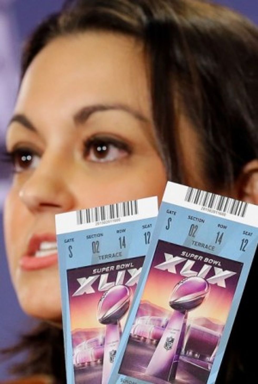 NFL Counsel Dolores F. Dibella holds up Super Bowl tickets to show the security features on them during a counterfeit ticket and merchandise news conference for NFL Super Bowl XLIX, Thursday, Jan. 29, 2015, in Phoenix. (Image source: AP/Morry Gash)