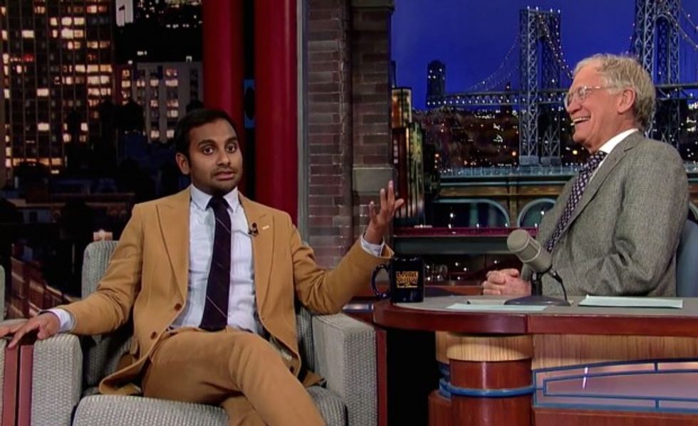 Aziz Ansari with "Late Show" host David Letterman. (Image via Late Show/YouTube)