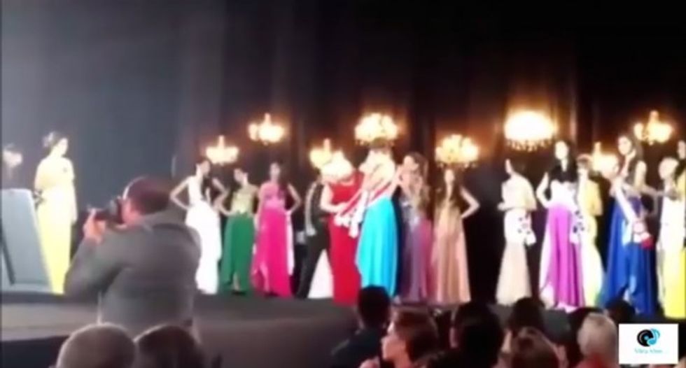 Video from the pageant, held in Manaus, Brazil, shows blue-clad Carolina Toledo and red-clad Sheislan Hayall holding hands as they await the final judges' decision.