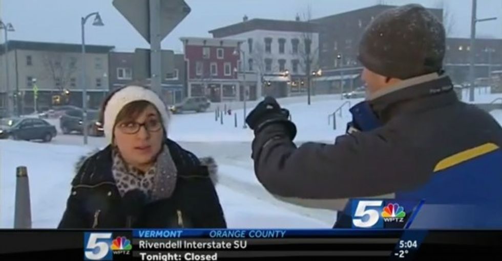 While snow storms wreak havoc on the northern states of the U.S., a pair of reporters with Vermont's WPTZ-TV set out to film a news clip on the dangerous weather Monday evening — and they just happened to catch a perfect example of the conditions.